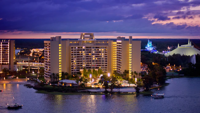 he crescent-shaped Bay Lake Tower blends modern architectural sensibilities with the trademark visual cues of its influential neighbor, Disney’s Contemporary Resort. Defined by glass-wrapped columns and warm woven woods, Bay Lake Tower is conveniently located within walking distance of restaurants, tennis courts, a health club, and other recreational activities.